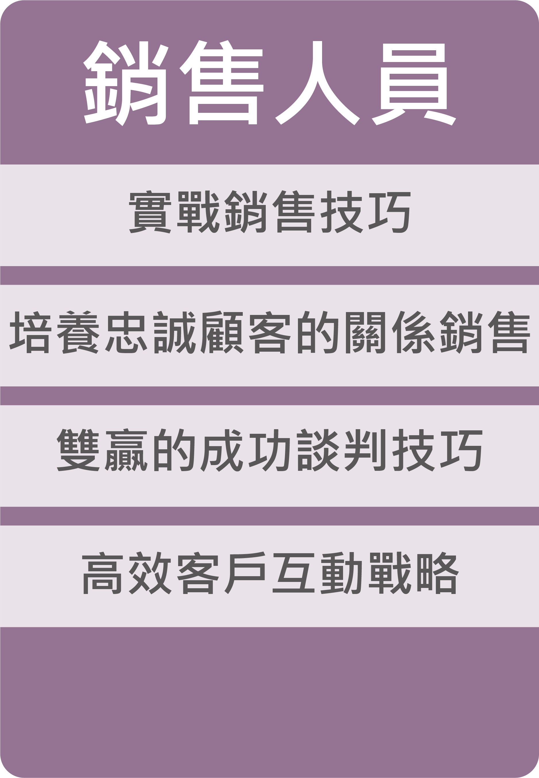 | 08/29 | 五 | 培養忠誠顧客的關係銷售 | 7H | |